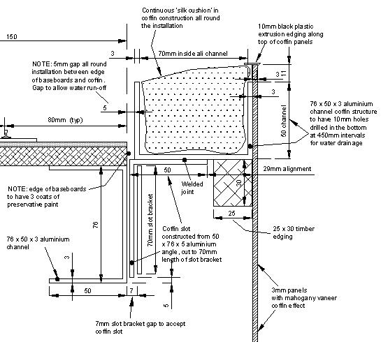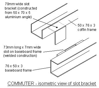 The framework of the coffin is constructed from 76 x 50 x 3 aluminium channel. All joints welded. The coffin has to be easily transportable and so it consists of 19 panels. The largest panel is 2000mm x 550mm. The 19 panels slot on to the baseboards. The diagram below shows the general principle of these slot brackets. There is a 5mm gap between the edge of the baseboards and the coffin frame. This is to allow water run off when Commuter is being displayed outdoors.